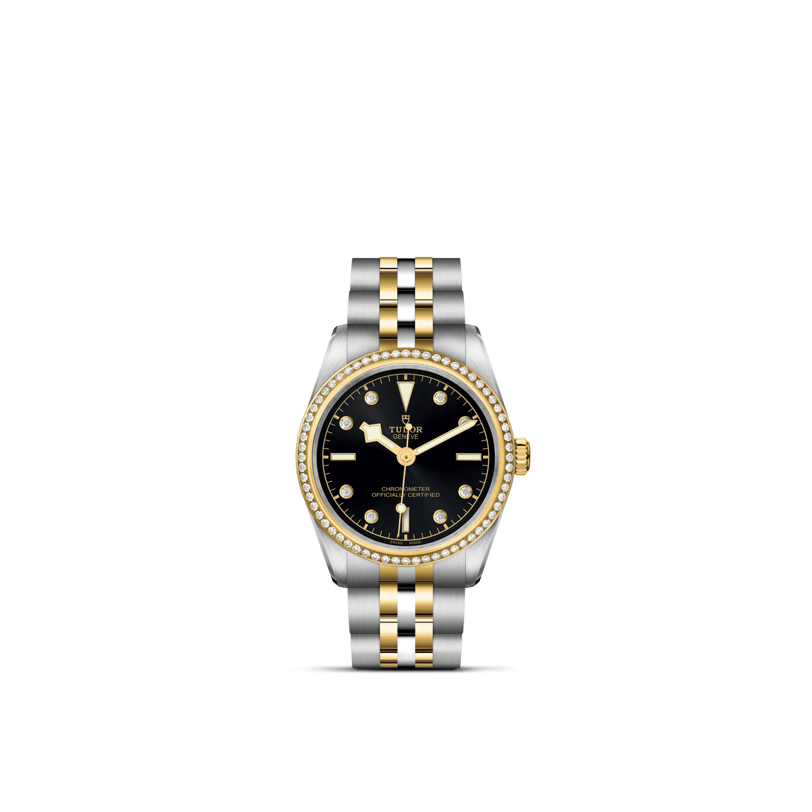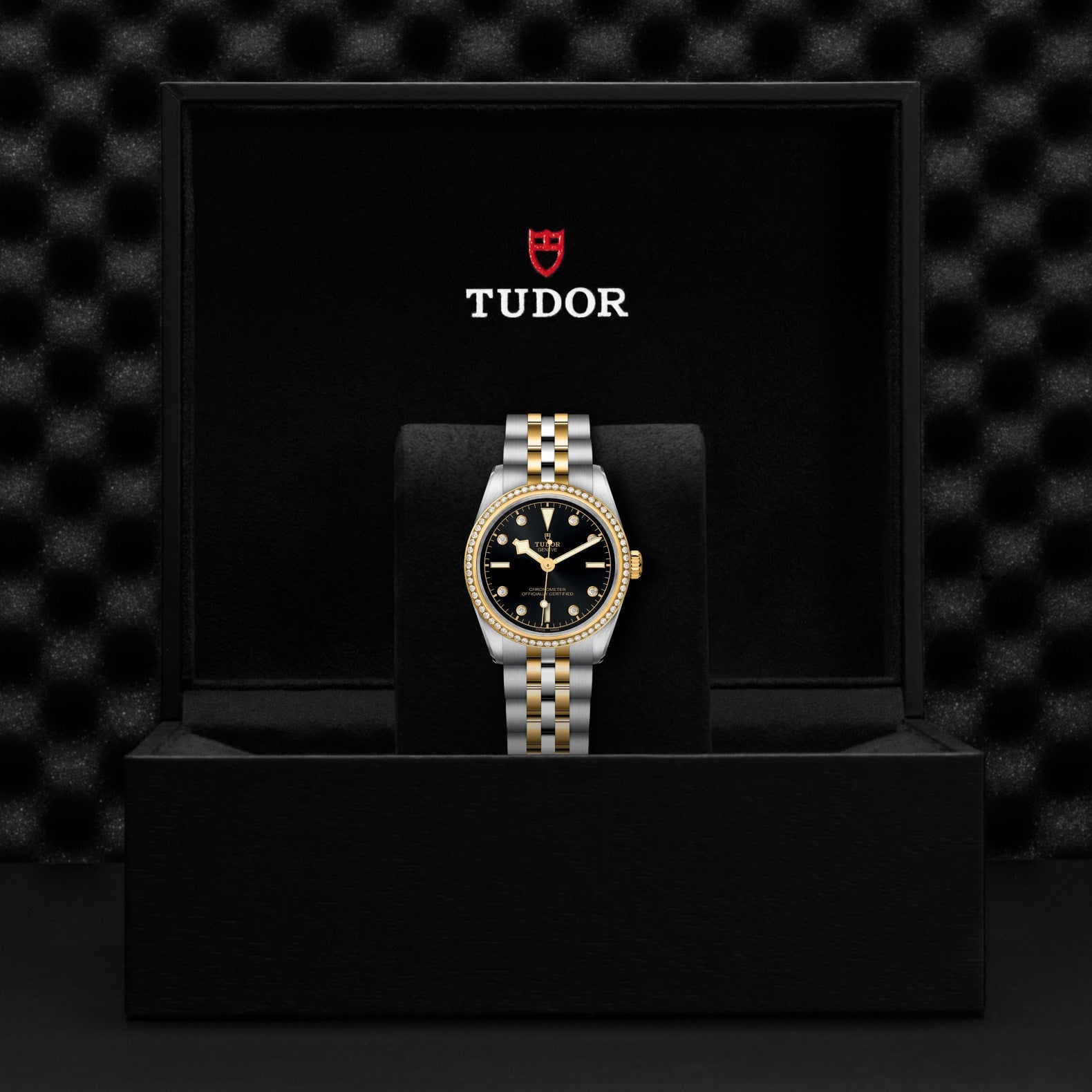 最初のセンターリンクはスチール製またはイエローゴールド製。そのほかのセンターリンクは、スチール製の芯に厚さ0.2 mmのイエローゴールドキャップを施している。チューダー独自の“T-fit”セーフティキャッチ付きフォールディングクラスプ。キャッチのロゴはイエローゴールド製
